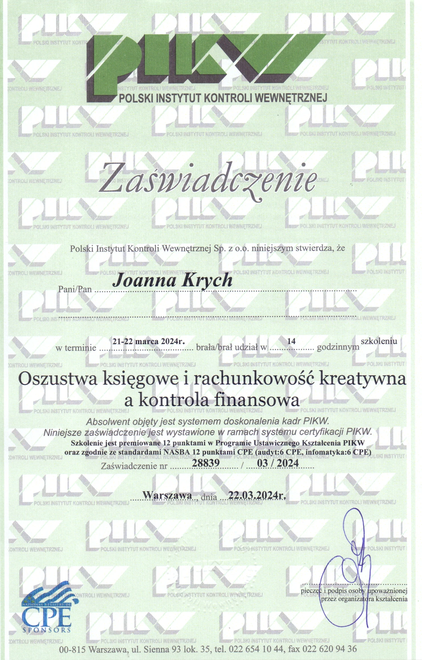 Spółka posiada audytora Joannę Krych wpisaną od 2019 roku na Krajową Listę Audytorów, Kontrolerów i Specjalizacji Powiązanych prowadzoną przez Polski Instytut Kontroli Wewnętrznej. Dodatkowo jest absolwentką Ekonomii Uniwersytetu Łódzkiego, która posiada dwudziestoletnie doświadczenie w księgowości, w tym od dziesięciu lat na stanowisku Głównej Księgowej w spółkach prawa handlowego.